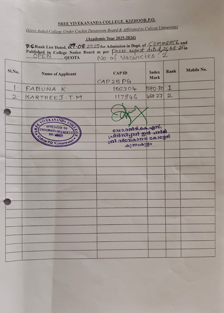 PG Spot Admission 2025–26sonuakm77Aug 291 min readPG COMMERCE SPOT RANK LISTVacant seats are available in M.Com (Marketing) and M.A. (English/Malayalam) at Sree Vivekananda College, Kunnamkulam. Eligible candidates should report with original certificates on 26th August 2025 at 2.00 PM